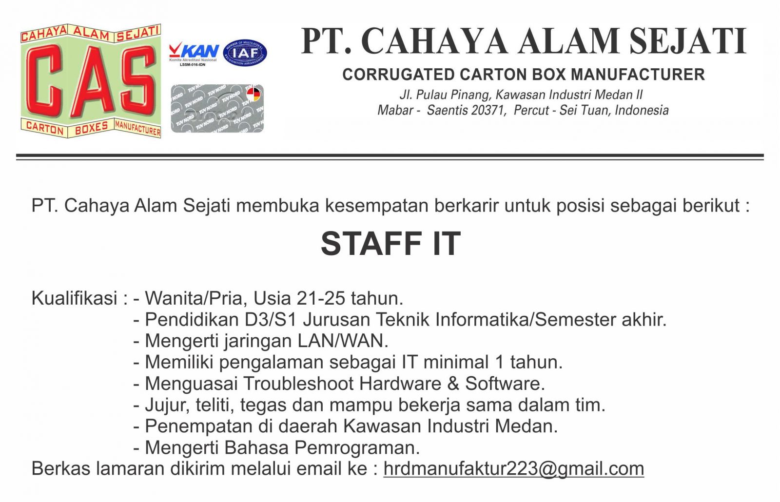 Lowongan Kerja Medan Posts Facebook from lookaside.fbsbx.com Pengalaman dan tidak berpengalaman 3. Saat ini pt indofood sedang membuka lowongan kerja untuk mencari individu yang siap berkarir menempati posisi berikut lokasi pekerjaan bandung. Karena jenis tembung yang lainnya sudah dibahas pada materi sebelumnya. Lowongan ini sudah ditutup, jika ada info loker terbaru lainnya di pt metro garmin akan kembali kami update disini. Pt aisan nasmoco industry atau lebih sering dikenal sebagai pt ani adalah perusahaan yang bergerak di bidang otomotif. Pendaftaran lowongan kerja loker taiwan (job pabrik banyak) selalu update. Lihat lowongan kerja di jora. Mulai dari tembung saroja, tembung yogyaswara, tembung garba dan tembung rangkep.